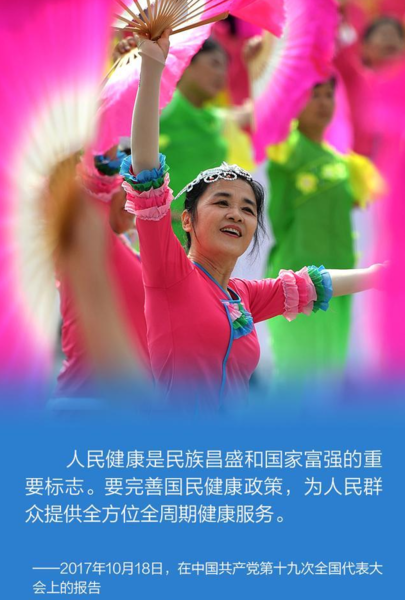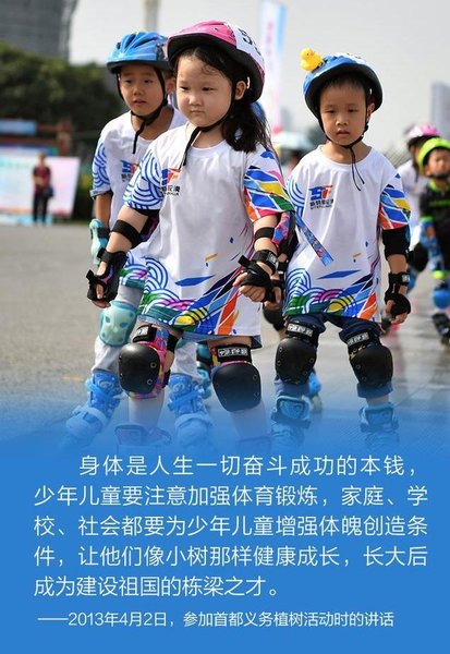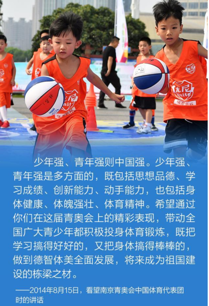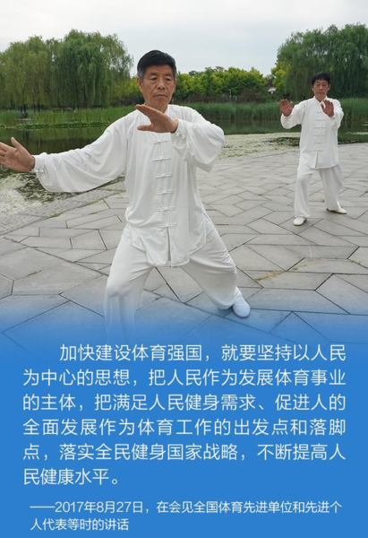 “全民健身是全体人民增强体魄、健康生活的基础和保障,人民身体健康是全面建成小康社会的重要内涵,是每一个人成长和实现幸福生活的重要基础。我们要广泛开展全民健身运动,促进群众体育和竞技体育全面发展。”
