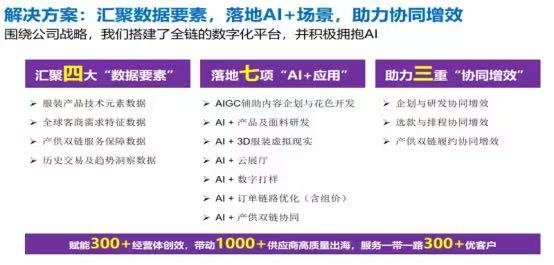 项目以“数据要素xAI技术x协同机制”三位一体为核心,构建全球化科贸一体化平台。已建立含18000+款式、6000+面料的数据库,覆盖3000+全球供应商;AI在研发端提效60%、降本50%,供应链端实现智能排产与风险预警。项目价值显著,为全球产业链协同提供可复制的数字化基础设施。