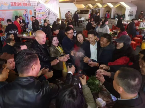 开幕晚会宴席获得葛帝酒赞助支持,组委会特别安排了一首《葛根花》引出当晚盛会的高潮,全体领导嘉宾上台祝酒新年,举杯庆贺“朱槿花开·光影丝路·马到成功!”庆祝开幕式圆满成功并迎接中国传统新年的到来。