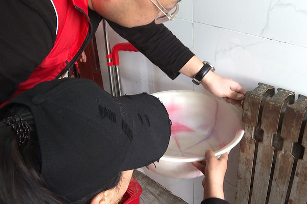 服务队的志愿者们第一时间分工协作,一人拿来洗手盆接水,一人将暖气片上的泄气阀缓慢拧开。由于压力过大,泄压时暖气片中的气压裹挟着热水喷溅出来,队员们无一幸免被暖气中积压的水浇了个遍,一时间屋子里充满了无奈的笑声。像这样的突发情况早已融入了日常,也早在他们的意料之中。