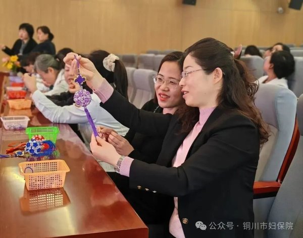 首先进行的是手工绣球穿珠制作环节。女职工们充分发挥心灵手巧的特长,穿针引线、珠转彩绕,将一颗颗晶莹剔透的珠子巧妙组合,制作成一个个造型精美、寓意团圆幸福的绣球。现场气氛轻松愉悦,大家互相交流技巧,分享创作乐趣,充分展现了妇幼人不仅业务精湛,更热爱生活、多才多艺的靓丽风采。
