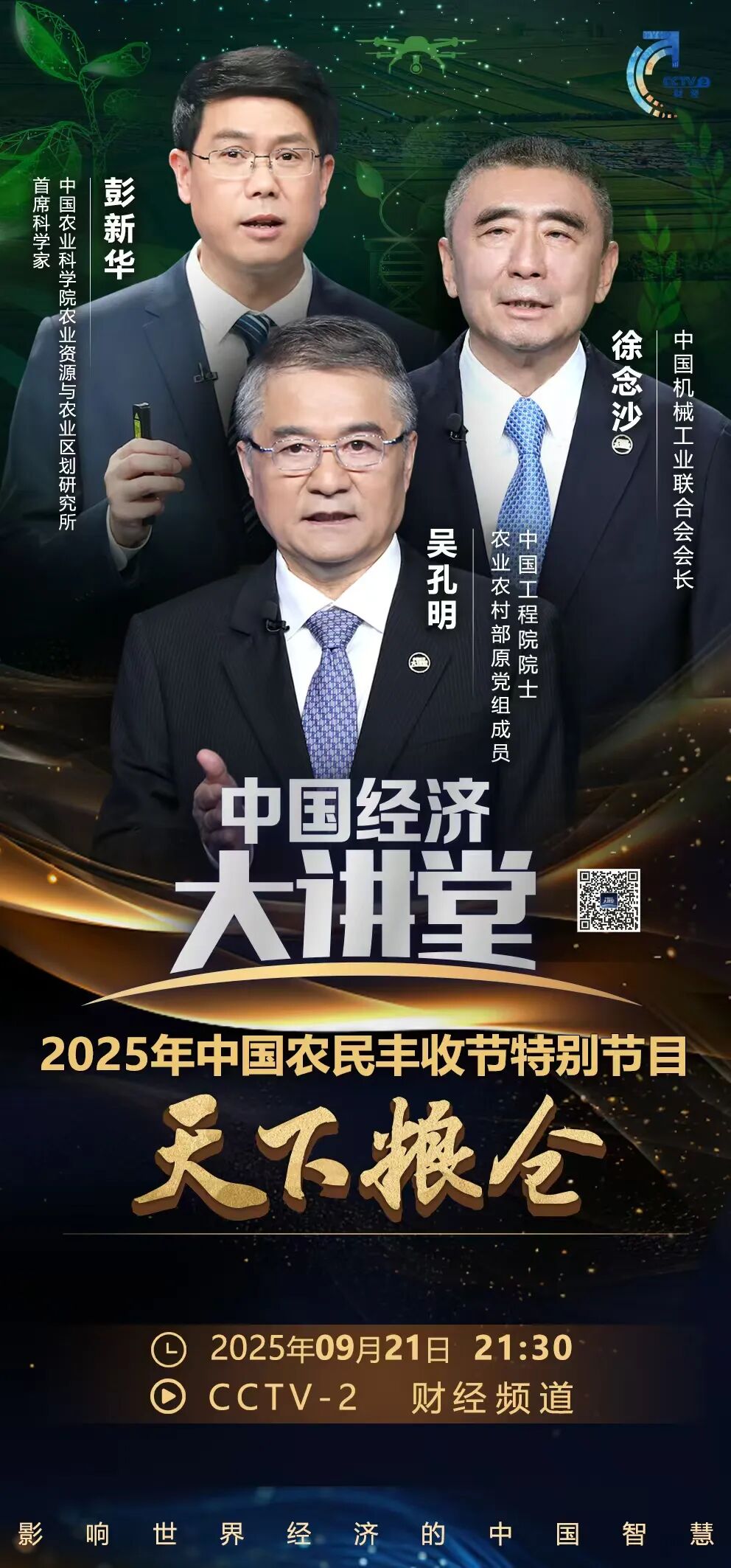 在《中国经济大讲堂》2025中国农民丰收节特别节目“天下粮仓”中,徐念沙会长将深度解析中国农业机械的硬核实力——从托起“大国粮仓”的14大类农机装备,到力量更强、作业更精准、效率更卓越的四大技术优势,揭开现代化农业背后的科技引擎。
