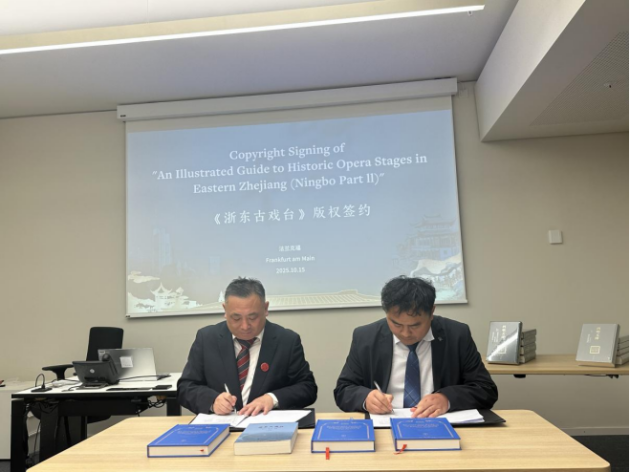 书展期间,博思林国际出版社和宁波出版社联合在法兰克福大学举行了《浙东古戏台》版权签约仪式,博思林国际出版社中国区首席代表徐伟志、宁波出版社社长袁志坚代表签约方签署版权协议。法兰克福大学前副校长Rolf Van Dick、法兰克福大学语言文化学院院长Anja Kloeckner教授、副院长杨治宜教授、法兰克福大学孔子学院中方院长金日及师生代表出席签约仪式。博思林国际出版社与法兰克福大学孔子学院及法兰克福大学有关学院达成初步合作意向,双方表示将进一步开展深度合作,共同致力于推动中德文明交流互鉴。