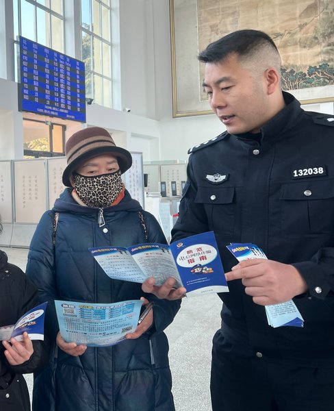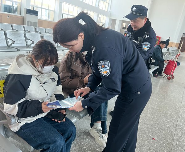 2月4日,邹城市公安局民警走进该市火车站开展反电诈宣传活动。工作中,他们在济南铁路公安派出所民警和客运站职工的大力支持配合下,利用进站口、候车厅的设备场地,布设视频、图片宣传屏,为进出站和候车旅客们提供醒目的反电诈提示,站里站外营造了浓厚的反电诈防骗宣传氛围。同时他们对来往旅客讲解当前的电诈形势,列举典型的诈骗类型及案例,提醒广大旅客提高警惕、加强防范,守好钱袋过新年。